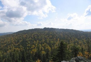От моста дорога, ведущая к горам, не доходя до Тесьминского пруда, сворачивает направо, в лес. Практически сразу же от речной долины начинается набор высоты, заставляющий хорошо попотеть. Крутой подъем длится около полутора километров. Несколько облегчает участь туристов-пешеходников обзор горной тайги. Целебен для легких неповторимый запах пихты, радует глаз и лиственница, чья хвоя осенью густо осыпает все вокруг. Здесь уже встречаются вечнозеленые плауны. Можно сказать, что эти древние растения вообще являются символом Таганая, ибо растут вдоль наиболее посещаемых туристами маршрутов.